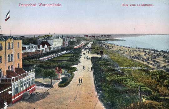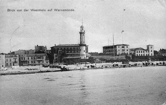 „Blick von der Westmole auf Warnemünde um 1907“.